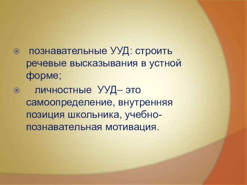 личностные УУД– это самоопределение, внутренняя позиция школьника, учебно-познавательная мотивация.