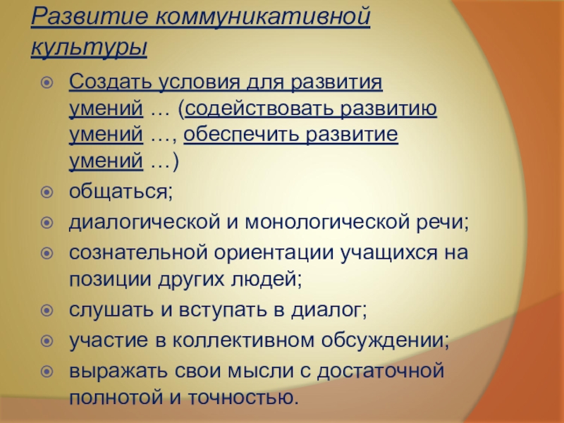 Создать условия для развития умений … (содействовать развитию умений …, обеспечить развитие