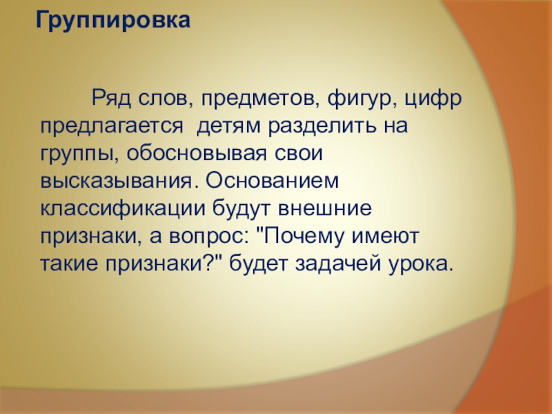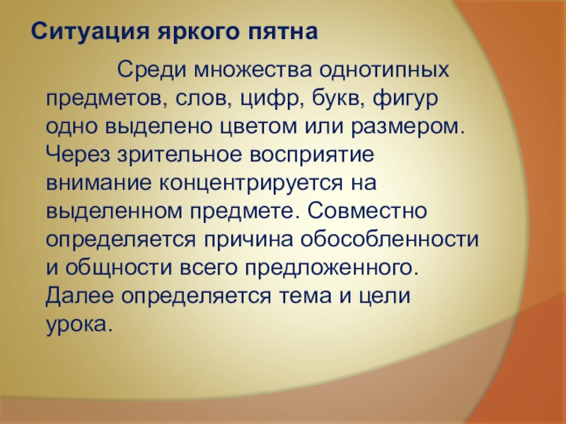 слов, цифр, букв, фигур одно выделено цветом или размером. Через зрительное восприятие внимание концентрируется на выделенном предмете. Совместно определяется причина обособленности и общности всего предложенного. Далее определяется тема и цели урока.