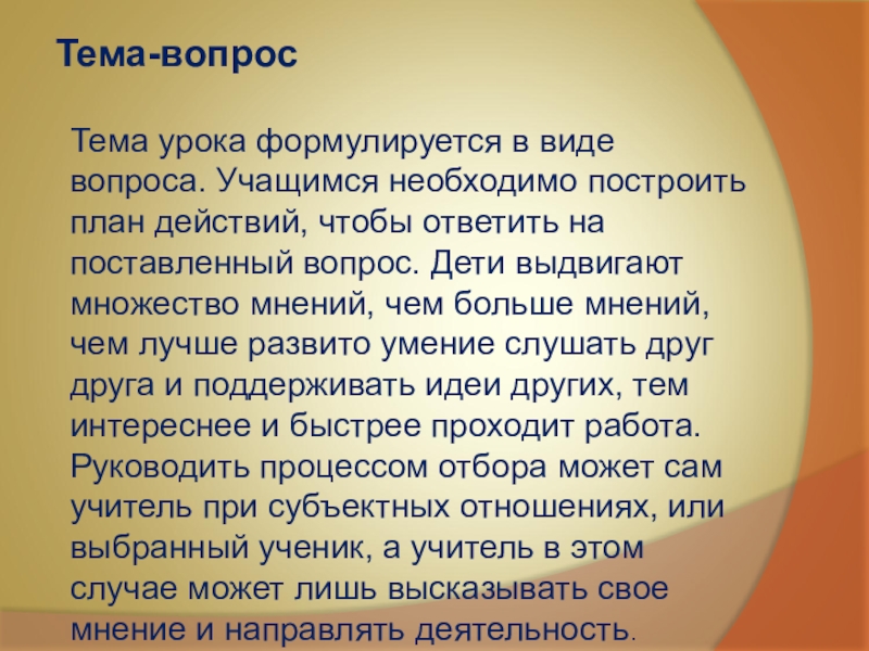 чтобы ответить на поставленный вопрос. Дети выдвигают множество мнений, чем больше мнений, чем лучше развито умение слушать друг друга и поддерживать идеи других, тем интереснее и быстрее проходит работа. Руководить процессом отбора может сам учитель при субъектных отношениях, или выбранный ученик, а учитель в этом случае может лишь высказывать свое мнение и направлять деятельность.