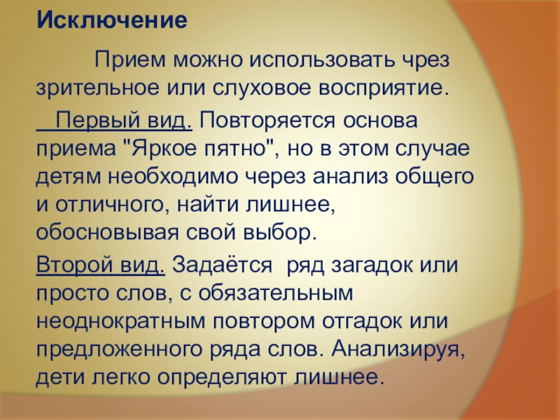 Второй вид. Задаётся ряд загадок или просто слов, с обязательным неоднократным повтором отгадок или предложенного ряда слов. Анализируя, дети легко определяют лишнее.