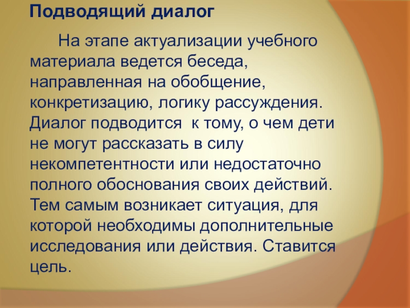 направленная на обобщение, конкретизацию, логику рассуждения. Диалог подводится к тому, о чем дети не могут рассказать в силу некомпетентности или недостаточно полного обоснования своих действий. Тем самым возникает ситуация, для которой необходимы дополнительные исследования или действия. Ставится цель.