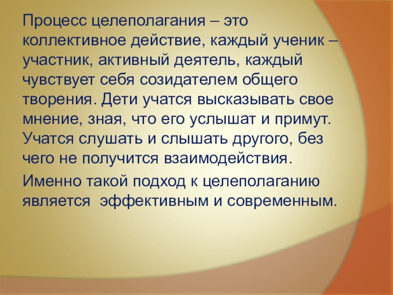 Процесс целеполагания – это коллективное действие, каждый ученик – участник, активный