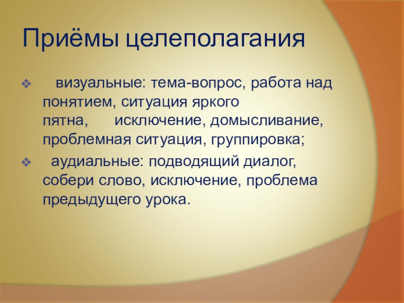 визуальные: тема-вопрос, работа над понятием, ситуация яркого пятна,