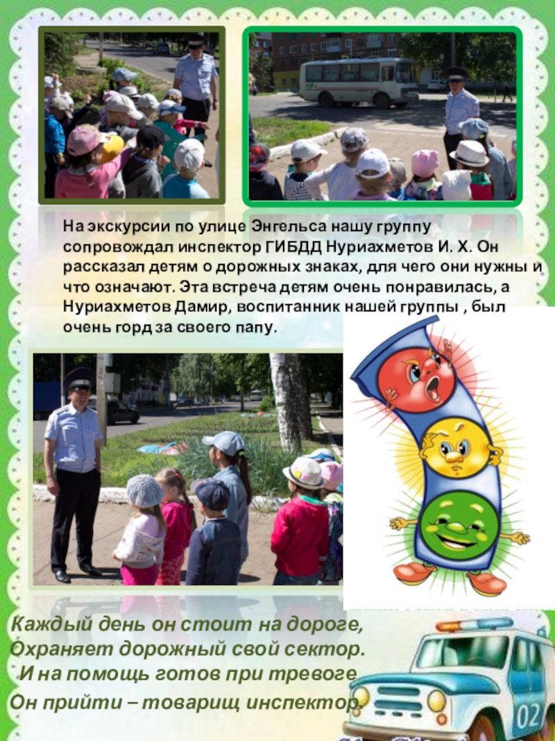 На экскурсии по улице Энгельса нашу группу сопровождал инспектор ГИБДД Нуриахметов И. Х. Он рассказал детям о дорожных знаках, для чего они нужны и что означают. Эта встреча детям очень понравилась, а Нуриахметов Дамир, воспитанник нашей группы , был очень горд за своего папу.