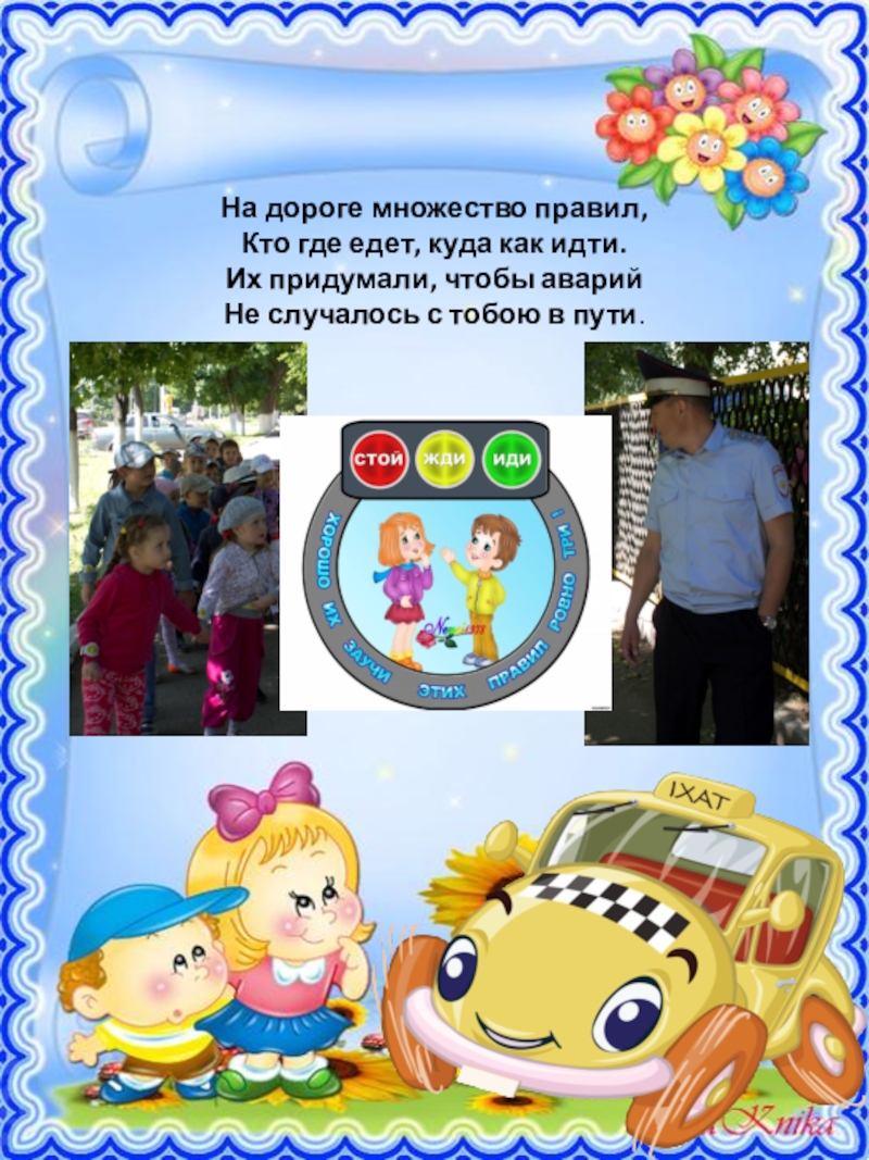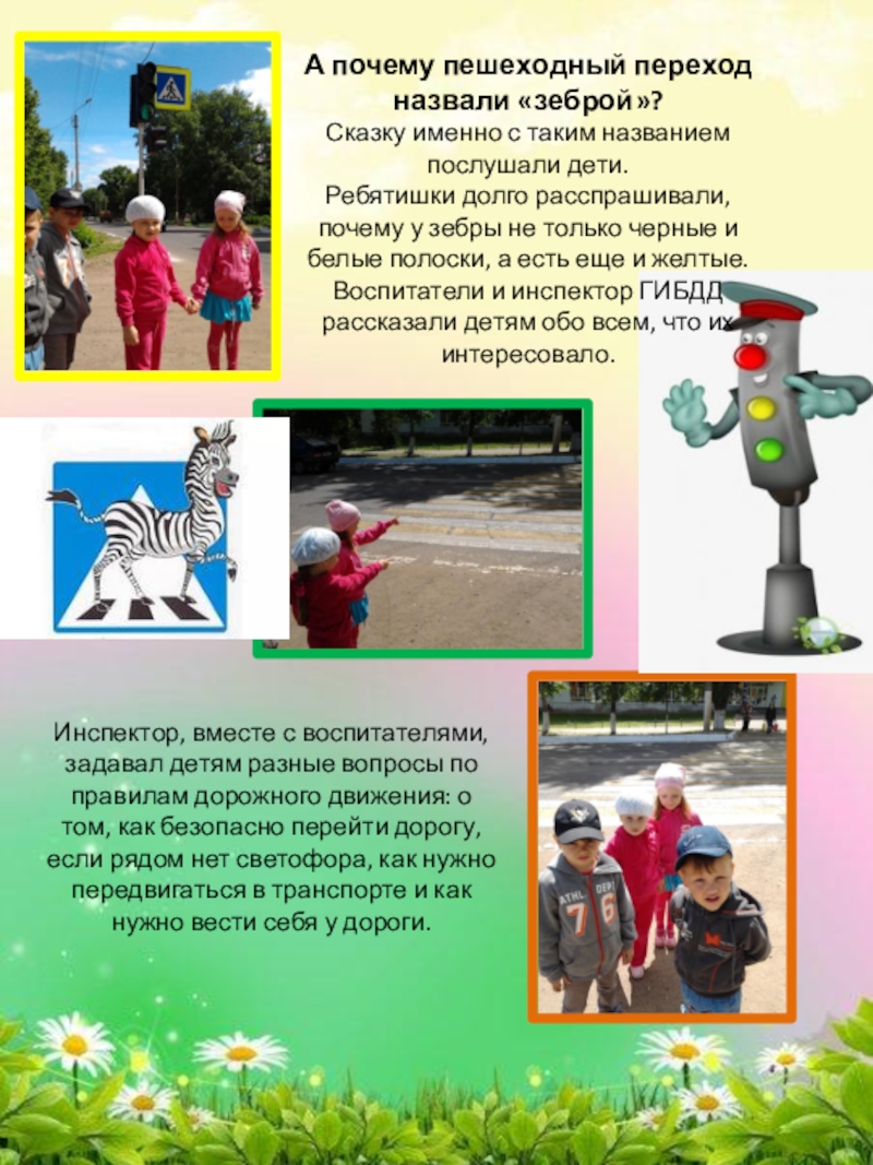 Инспектор, вместе с воспитателями, задавал детям разные вопросы по правилам дорожного движения: о том, как безопасно перейти дорогу, если рядом нет светофора, как нужно передвигаться в транспорте и как нужно вести себя у дороги.