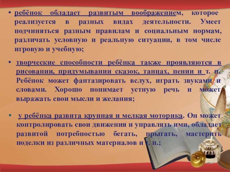 творческие способности ребёнка также проявляются в рисовании, придумывании сказок, танцах, пении и т. п. Ребёнок может фантазировать вслух, играть звуками и словами. Хорошо понимает устную речь и может выражать свои мысли и желания;