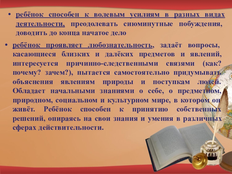 ребёнок проявляет любознательность, задаёт вопросы, касающиеся близких и далёких предметов и явлений, интересуется причинно-следственными связями (как? почему? зачем?), пытается самостоятельно придумывать объяснения явлениям природы и поступкам людей. Обладает начальными знаниями о себе, о предметном, природном, социальном и культурном мире, в котором он живёт. Ребёнок способен к принятию собственных решений, опираясь на свои знания и умения в различных сферах действительности.