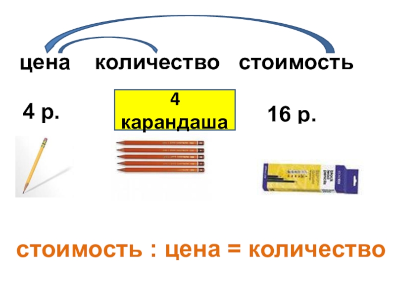 цена  количество  стоимость4 р.?16 р.стоимость : цена = количество4 карандаша