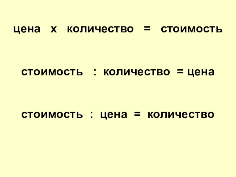 цена  х  количество  =  стоимостьстоимость  : количество = ценастоимость : цена =