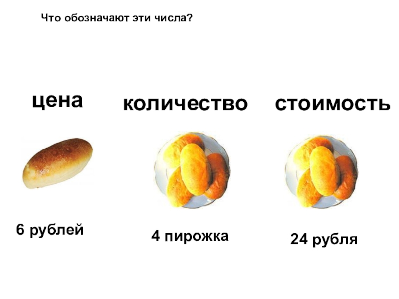 4 пирожка24 рубляЧто обозначают эти числа?ценаколичествостоимость6 рублей