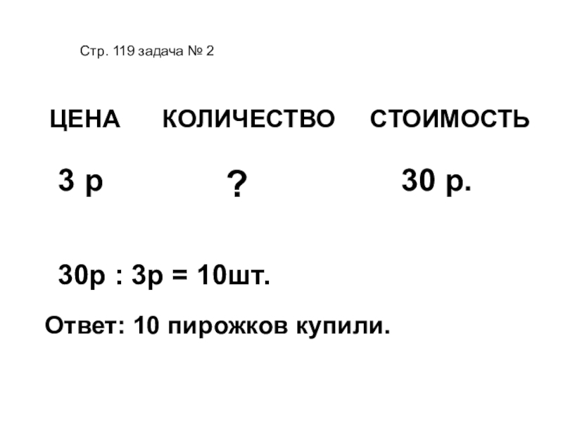 Стр. 119 задача № 2ЦЕНА   КОЛИЧЕСТВО   СТОИМОСТЬ3 р30 р.?30р : 3р = 10шт.Ответ: