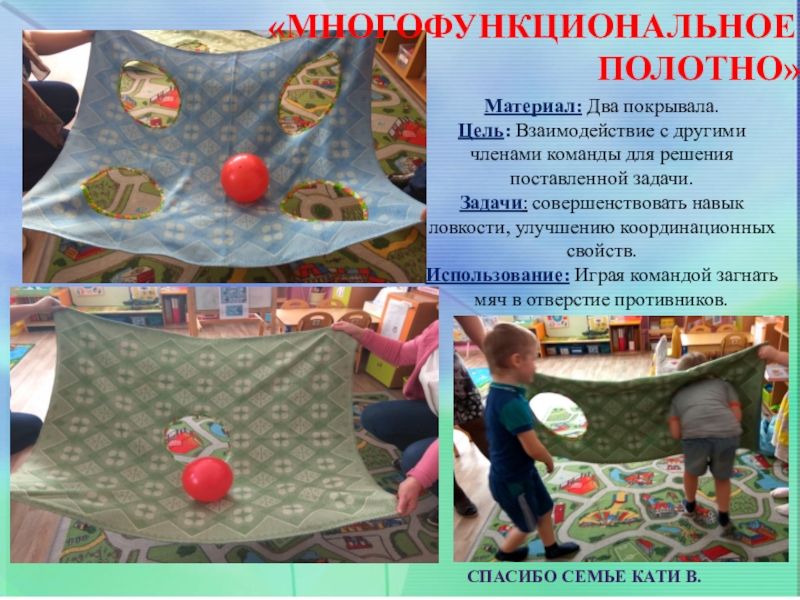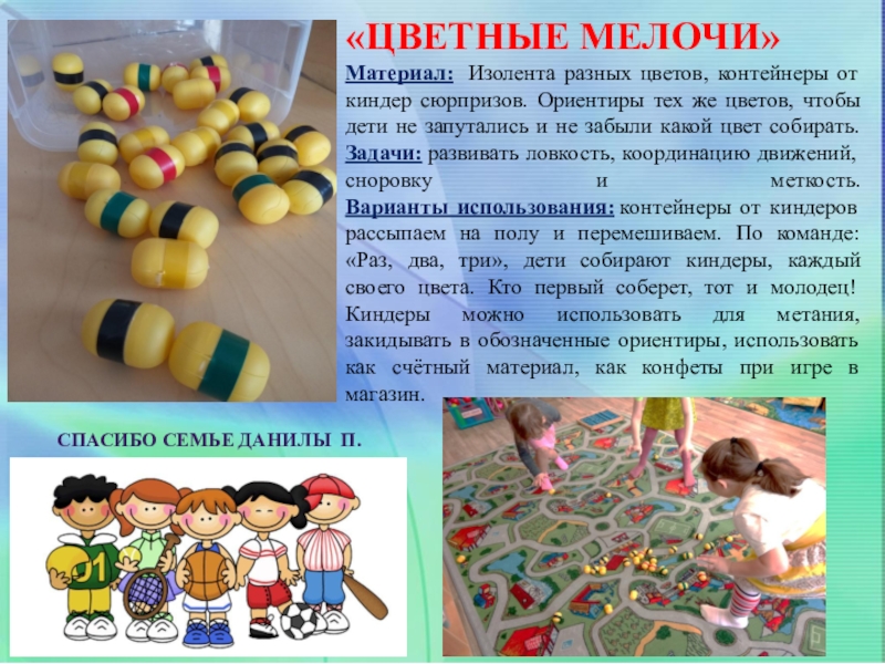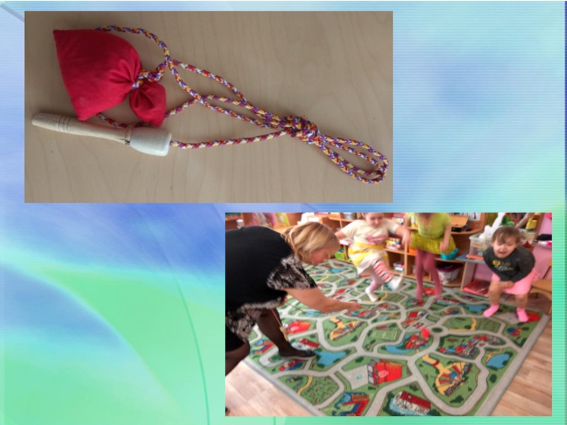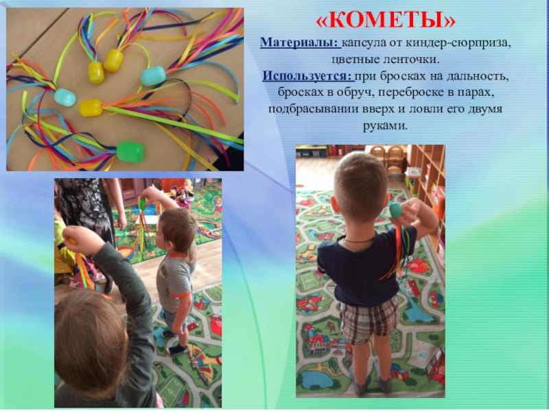 Материал: разноцветные ленты, колечки, резиночки, мячи, кубики и т.д.