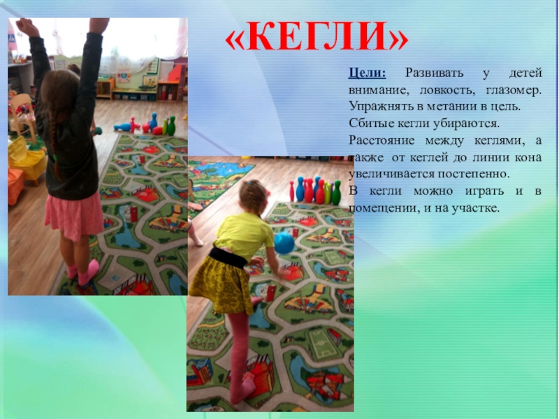 Слайд 28Цели: Развивать у детей внимание, ловкость, глазомер. Упражнять в метании в