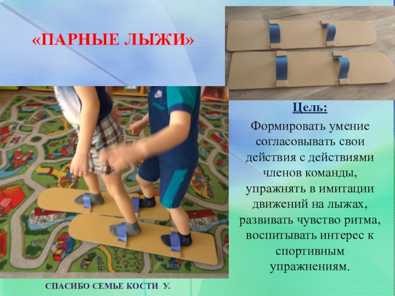 членов команды, упражнять в имитации движений на лыжах, развивать чувство ритма, воспитывать интерес к спортивным упражнениям.