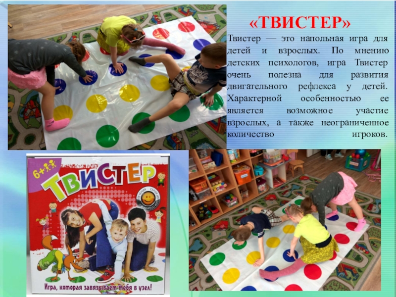 взрослых. По мнению детских психологов, игра Твистер очень полезна для развития двигательного рефлекса у детей. Характерной особенностью ее является возможное участие взрослых, а также неограниченное количество игроков.