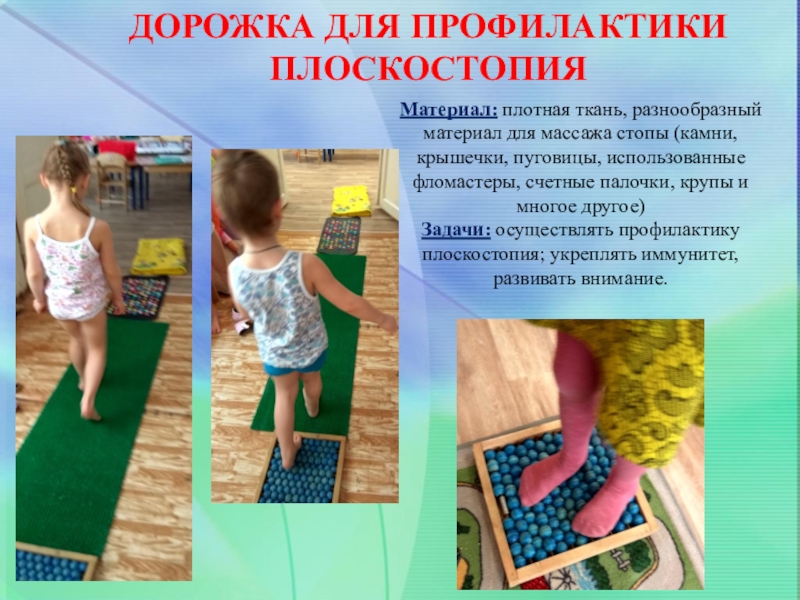 Задачи: осуществлять профилактику плоскостопия; укреплять иммунитет, развивать внимание.