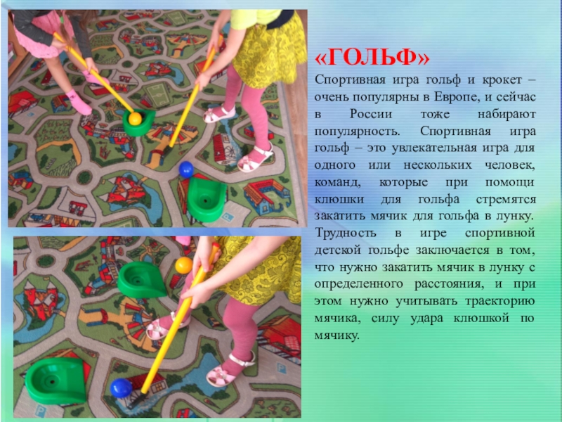 сейчас в России тоже набирают популярность. Спортивная игра гольф – это увлекательная игра для одного или нескольких человек, команд, которые при помощи клюшки для гольфа стремятся закатить мячик для гольфа в лунку. Трудность в игре спортивной детской гольфе заключается в том, что нужно закатить мячик в лунку с определенного расстояния, и при этом нужно учитывать траекторию мячика, силу удара клюшкой по мячику.