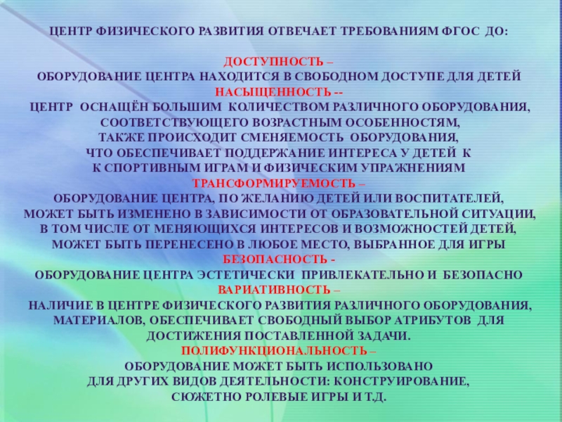 Слайд 5Центр физического развития отвечает требованиям фгос ДО: