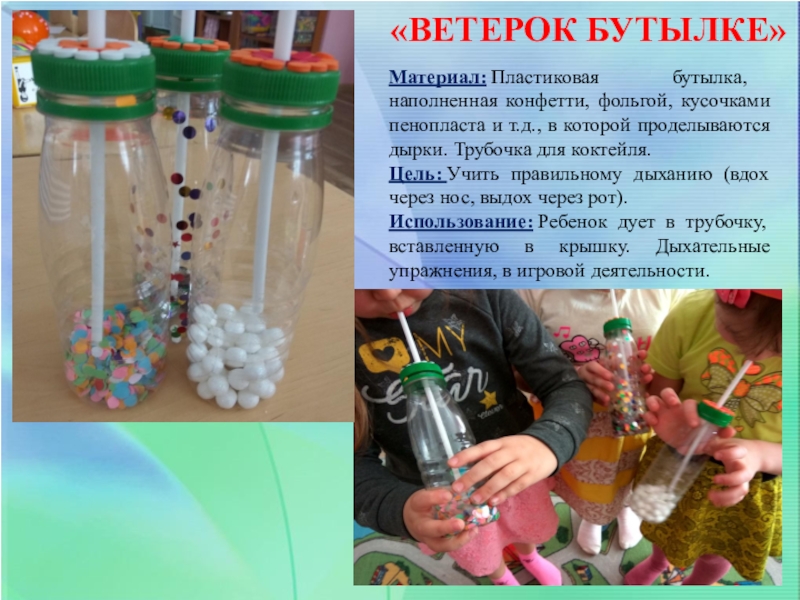 Слайд 11Материал: Пластиковая бутылка, наполненная конфетти, фольгой, кусочками пенопласта и т.д., в которой