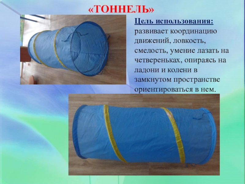 Цель использования: развивает координацию движений, ловкость, смелость, умение лазать на четвереньках,