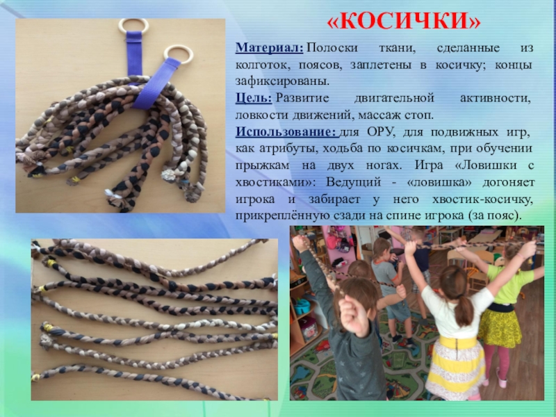 Использование: для ОРУ, для подвижных игр, как атрибуты, ходьба по косичкам, при обучении прыжкам на двух ногах. Игра «Ловишки с хвостиками»: Ведущий - «ловишка» догоняет игрока и забирает у него хвостик-косичку, прикреплённую сзади на спине игрока (за пояс).