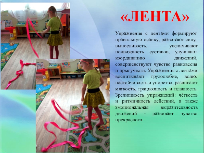 суставов, улучшают координацию движений, совершенствуют чувство равновесия и прыгучести. Упражнения с лентами воспитывают трудолюбие, волю. настойчивость и упорство, развивают мягкость, грациозность и плавность. Зрелищность упражнений: чёткость и ритмичность действий, а также эмоциональная выразительность движений - развивает чувство прекрасного.