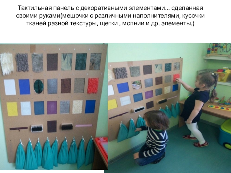 кусочки тканей разной текстуры, щетки , молнии и др. элементы.)