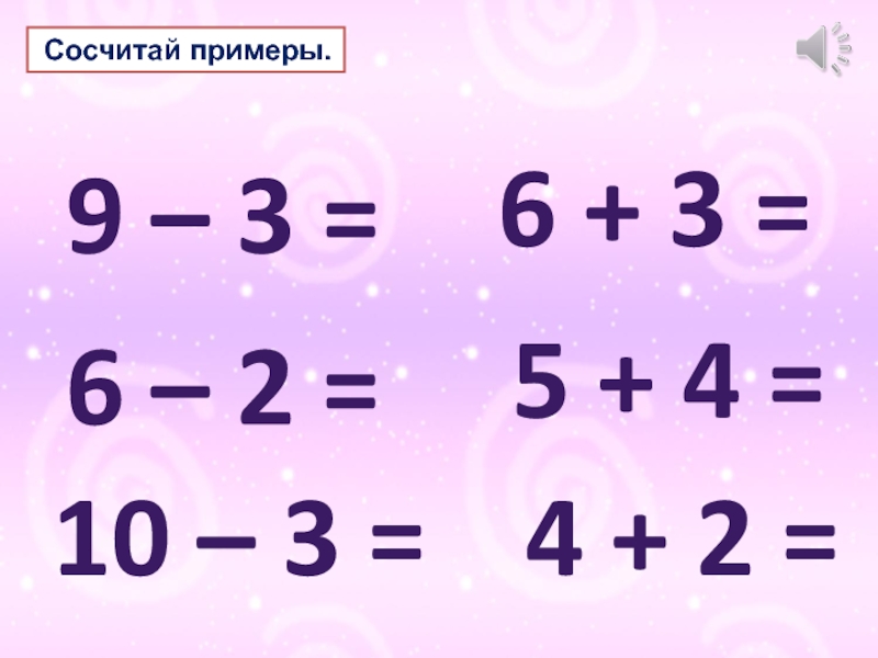 9 – 3 =6 – 2 =6 + 3 =5 + 4 =10 – 3 =4 +