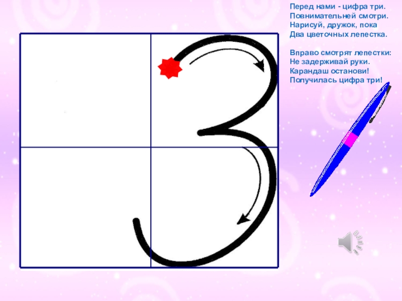Перед нами - цифра три. Повнимательней смотри. Нарисуй, дружок, пока Два цветочных лепестка. Вправо смотрят