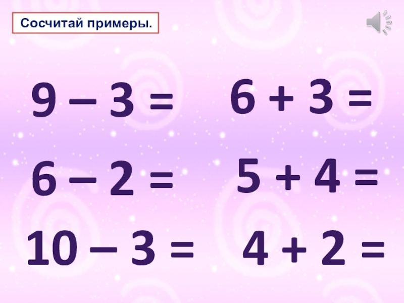 9 – 3 =6 – 2 =6 + 3 =5 + 4 =10 – 3 =4 +
