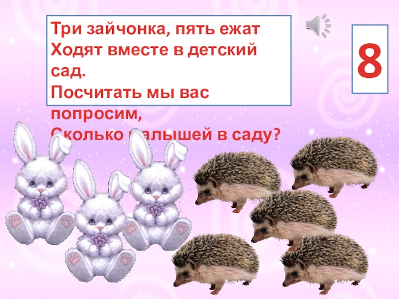 Три зайчонка, пять ежат  Ходят вместе в детский сад.  Посчитать мы вас попросим,  Сколько