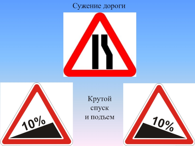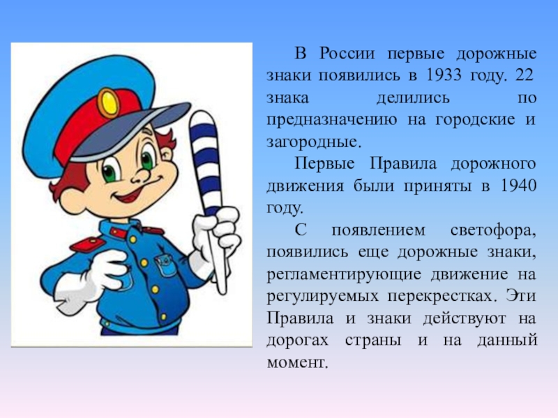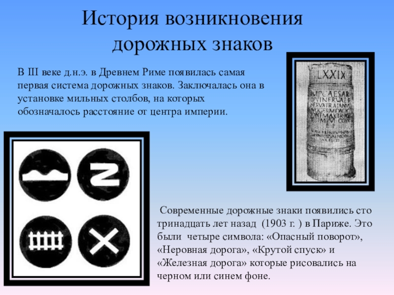 Современные дорожные знаки появились сто тринадцать лет назад (1903 г. ) в Париже. Это были четыре символа: «Опасный поворот», «Неровная дорога», «Крутой спуск» и «Железная дорога» которые рисовались на черном или синем фоне.