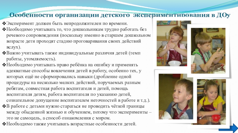 Слайд 8Особенности организации детского экспериментирования в ДОу