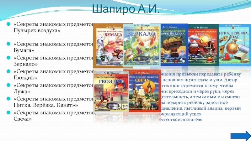Знания привыкли передавать ребёнку в основном через глаза и уши. Автор этих книг стремится к тому, чтобы они приходили и через руки, через деятельность, а тем самым мы смогли бы подарить ребёнку радостное удивление, пытливый анализ, первый окрыляющий успех естествоиспытателя