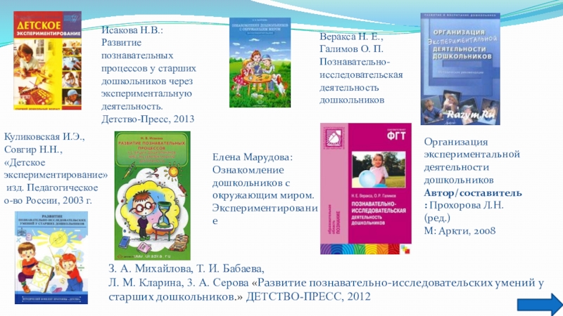 Л. М. Кларина, 3. А. Серова «Развитие познавательно-исследовательских умений у старших дошкольников.» ДЕТСТВО-ПРЕСС, 2012