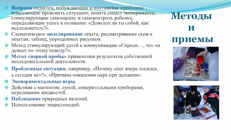 Проблемные ситуации, например, «Почему снег вчера лепился, а сегодня нет?», «Причина появления пара при дыхании» .