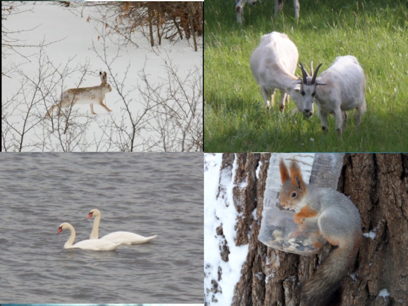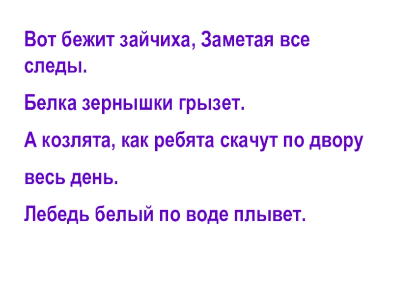 Вот бежит зайчиха, Заметая все следы.Белка зернышки грызет.А козлята, как ребята скачут по дворувесь день.Лебедь белый по