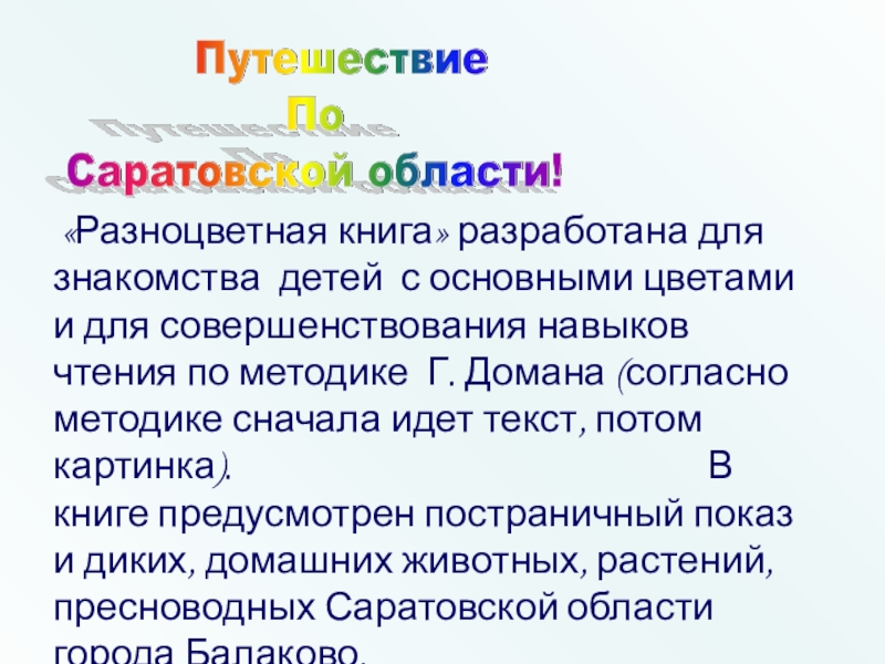 для совершенствования навыков чтения по методике Г. Домана (согласно методике сначала идет текст, потом картинка). В книге предусмотрен постраничный показ и диких, домашних животных, растений, пресноводных Саратовской области города Балаково.