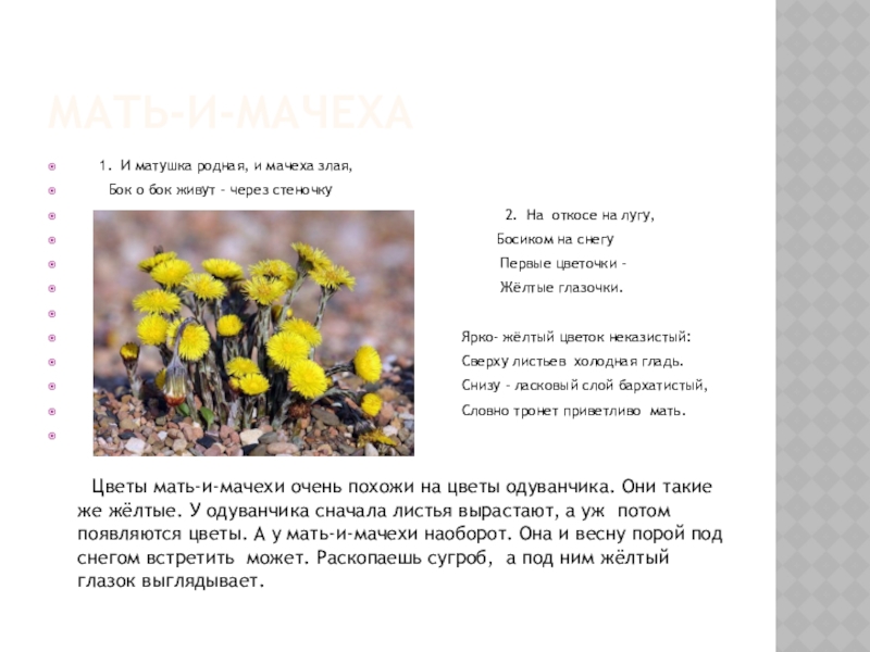 Цветы мать-и-мачехи очень похожи на цветы одуванчика. Они такие же жёлтые. У одуванчика сначала листья вырастают, а уж потом появляются цветы. А у мать-и-мачехи наоборот. Она и весну порой под снегом встретить может. Раскопаешь сугроб, а под ним жёлтый глазок выглядывает.