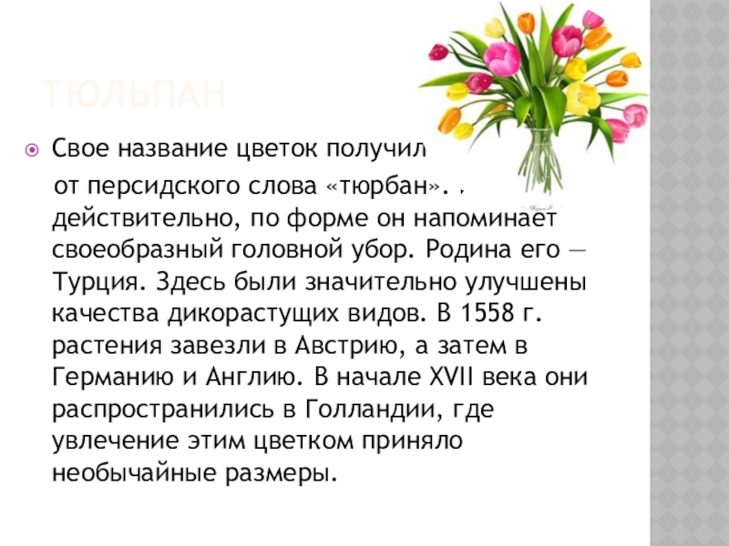 действительно, по форме он напоминает своеобразный головной убор. Родина его — Турция. Здесь были значительно улучшены качества дикорастущих видов. В 1558 г. растения завезли в Австрию, а затем в Германию и Англию. В начале XVII века они распространились в Голландии, где увлечение этим цветком приняло необычайные размеры.