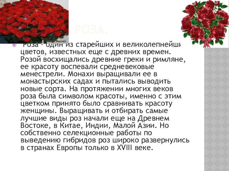 - один из старейших и великолепнейших цветов, известных еще с древних времен. Розой восхищались древние греки и римляне, ее красоту воспевали средневековые менестрели. Монахи выращивали ее в монастырских садах и пытались выводить новые сорта. На протяжении многих веков роза была символом красоты, именно с этим цветком принято было сравнивать красоту женщины. Выращивать и отбирать самые лучшие виды роз начали еще на Древнем Востоке, в Китае, Индии, Малой Азии. Но собственно селекционные работы по выведению гибридов роз широко развернулись в странах Европы только в XVIII веке.