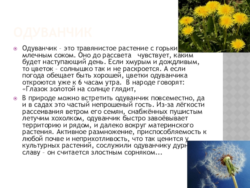 Одуванчик – это травянистое растение с горьким млечным соком. Оно до