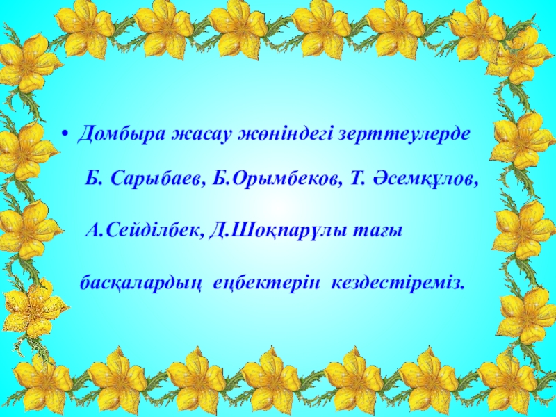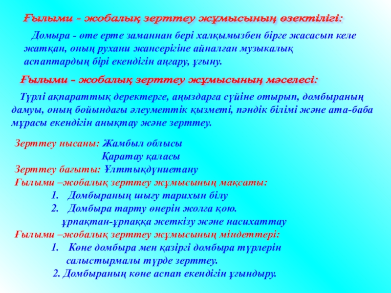 Түрлі ақпараттық деректерге, аңыздарға сүйіне отырып, домбыраның дамуы, оның бойындағы әлеуметтік қызметі, пәндік білімі және ата-баба мұрасы екендігін анықтау және зерттеу.