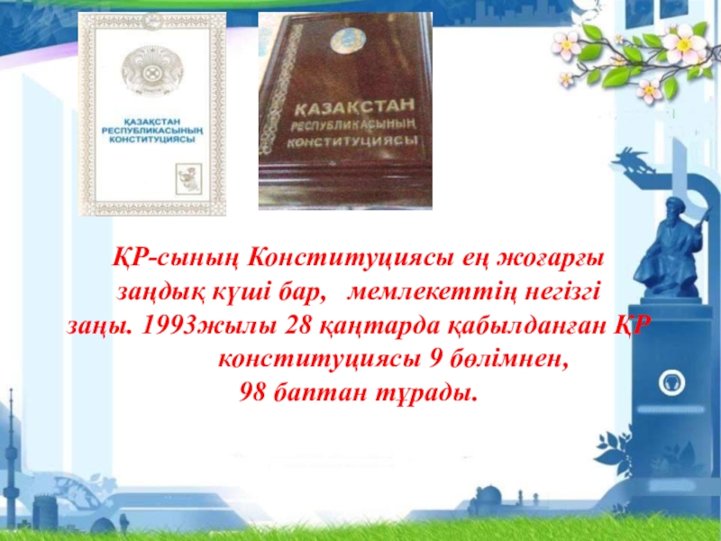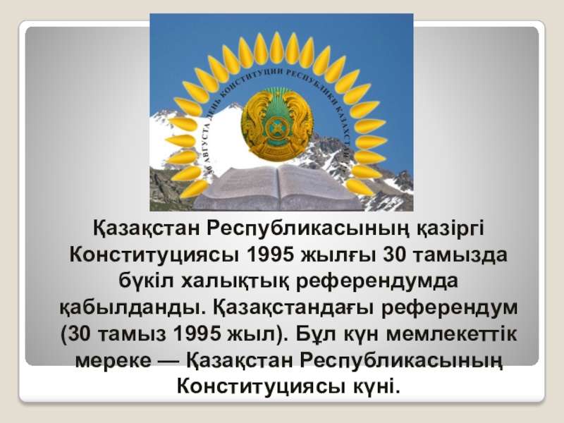 Слайд 32Қазақстан Республикасының қазіргі Конституциясы 1995 жылғы 30 тамызда бүкіл халықтық референдумда