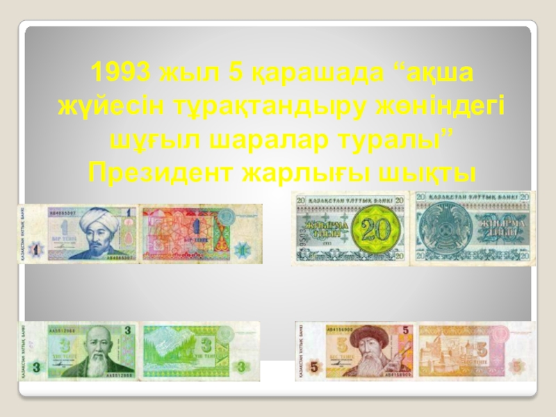 Слайд 261993 жыл 5 қарашада “ақша жүйесін тұрақтандыру жөніндегі шұғыл шаралар туралы”