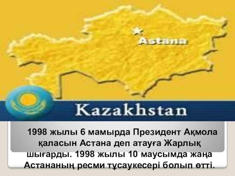 Слайд 371998 жылы 6 мамырда Президент Ақмола қаласын Астана деп атауға Жарлық