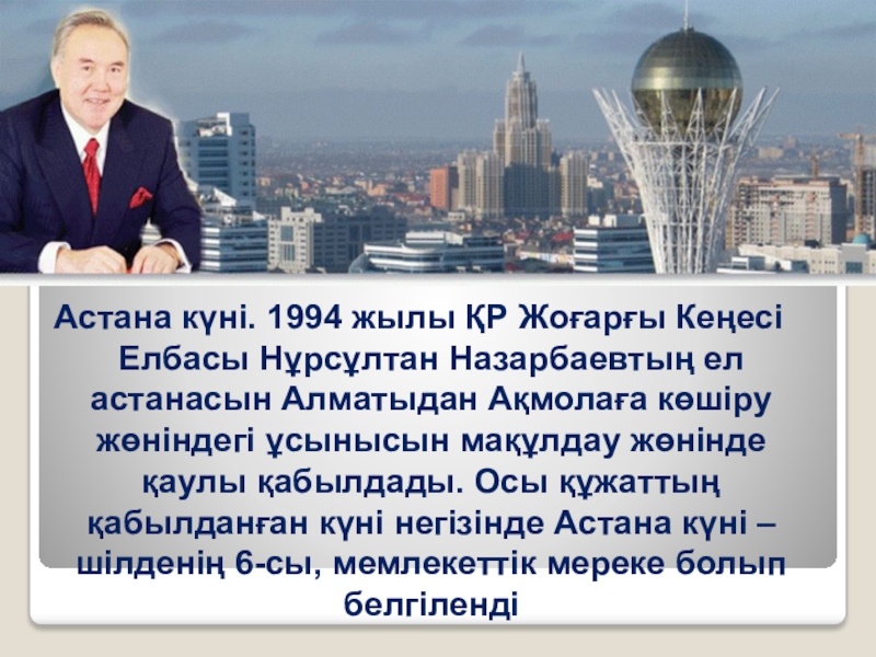 Слайд 29Астана күні. 1994 жылы ҚР Жоғарғы Кеңесі Елбасы Нұрсұлтан Назарбаевтың ел