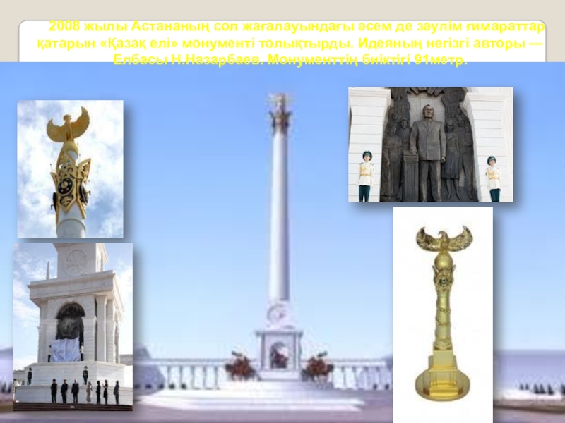 елі» монументі толықтырды. Идеяның негізгі авторы — Елбасы Н.Назарбаев. Монументтің биіктігі 91метр.