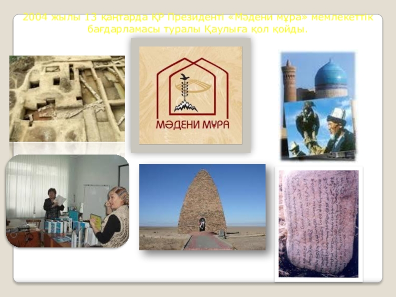 Слайд 502004 жылы 13 қаңтарда ҚР Президенті «Мәдени мұра» мемлекеттік бағдарламасы туралы